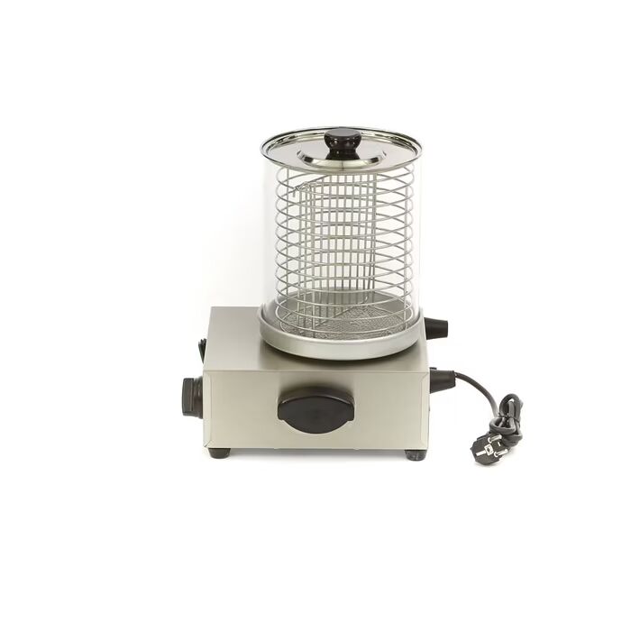 Fabriqué en acier inoxydable, cet appareil est conçu pour durer. Son cylindre en verre transparent permet de surveiller facilement les saucisses, tandis que ses poignées latérales facilitent son déplacement. -