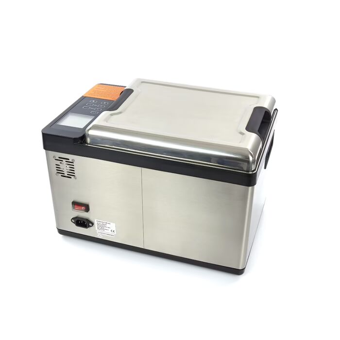 Dans cet appareil sous vide professionnel d'une capacité de 12,5 litres, l'eau du réservoir est progressivement chauffée, Les aliments ne brûlent pas et ne se séparent pas, car la température de l'eau ne peut pas dépasser 99ºC, La température et la durée peuvent être réglées séparément, En outre, cet appareil sous vide a une précision de 0,1ºC, Grâce à l'écoulement régulier de l'eau, vous pouvez créer une préparation parfaite et vous assurer que le goût, la texture et les nutriments sont préservés, L'écran LCD est numérique et le panneau de commande est facile à utiliser grâce aux boutons tactiles, L'appareil sous vide est également équipé d'un dispositif de sécurité thermique et le cordon d'alimentation peut être retiré,