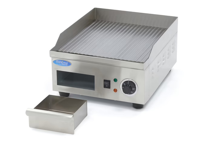 Si vous voulez préparer les plus délicieux plats de viande et de poisson, une plancha est indispensable dans la cuisine de restauration, La grillade préserve plus longtemps le goût et les vitamines et les plats sont cuits rapidement, L'avantage de cette plancha est qu'elle se réchauffe et se refroidit rapidement, La plancha possède une plaque de cuisson rainurée en acier de 8 mm d'épaisseur avec une finition satinée, Cet appareil de restauration convient donc parfaitement à une production élevée de plats et à une utilisation intensive, Grâce à la répartition uniforme de la chaleur, les aliments sont cuits de manière homogène,