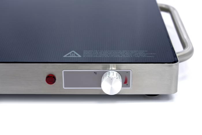 Avec une plaque en verre de qualité supérieure et un boîtier en acier inoxydable, c'est un autocuiseur professionnel dans la cuisine, La température est réglable en continu de 60°C à 105°C à l'aide d'un bouton rotatif, et la plaque chauffante est dotée d'une protection contre la surchauffe, Le bouton ON/OFF se trouve à l'arrière de l'appareil, et le témoin lumineux indique quand la plaque est en train de chauffer,